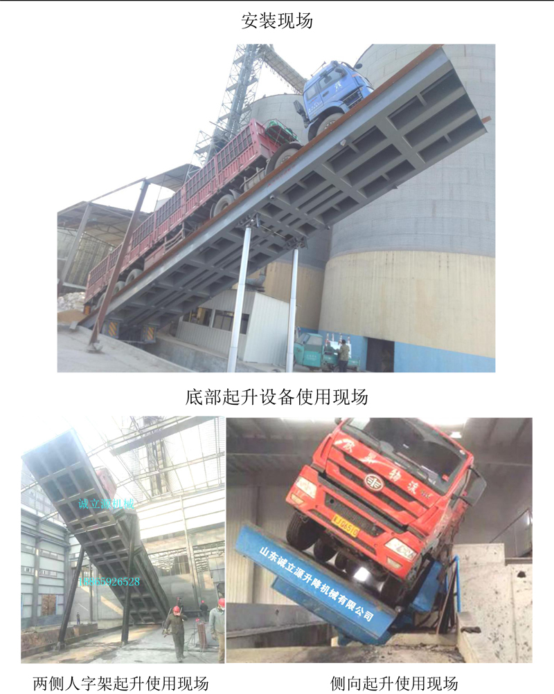 山东诚立源升降机械有限公司的液压侧翻、后翻自动卸车机广泛用于粮油加工,饲料加工,煤炭、水泥、造纸制浆,港口、电厂、焦化厂、车站、码头货厂提供了一种新型液压翻板卸车设备。产品经济实惠、技术先进、高效可靠。液压翻板卸车机保障了工作人员的安全性。通常用来装卸工矿企业内货车上的散装物料,为一线员工带来了便利。液压翻板卸车机转轴部分增加了耐磨损材料,使设备寿命延长;整机运行平稳,本卸车机的推广应用,提高了工作效率,减轻了劳动人力,使一般人员都能完成卸车工作,达到卸料速度快的目的。液压翻板卸车机在各大领域被广泛应用,它主要解决了一是人力成本高,二是生产效率低慢的问题。设备的运用大大提高了生产效率,通过 PLC 控制系统保证了卸车机整个卸车过程的安全及正常运作。本设备与客户其它设备的匹配结合,使生产有传统规模化向高效智能化转变。