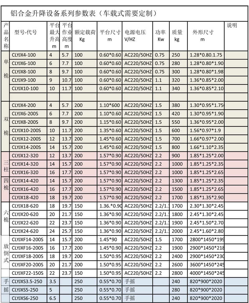 双桅柱豪华铝合金式升降平台: :全新设计的新一代产品,整体采用高强度铝型材精制而成由于型材强度高,使升降台的偏转与摆动极小。采用双桅柱式结构,载重量大,平台面积大,稳定性极好,运转灵活,推行方便。它轻盈的外观,能在小的空间内发挥好的举升能力。该升降机广泛用于厂房、宾馆、大厦、商场、车站、机场、体育场等。可用作电力线路、照明电器、高架管道等安装维护,高空清洁等单人工作的高空作业。