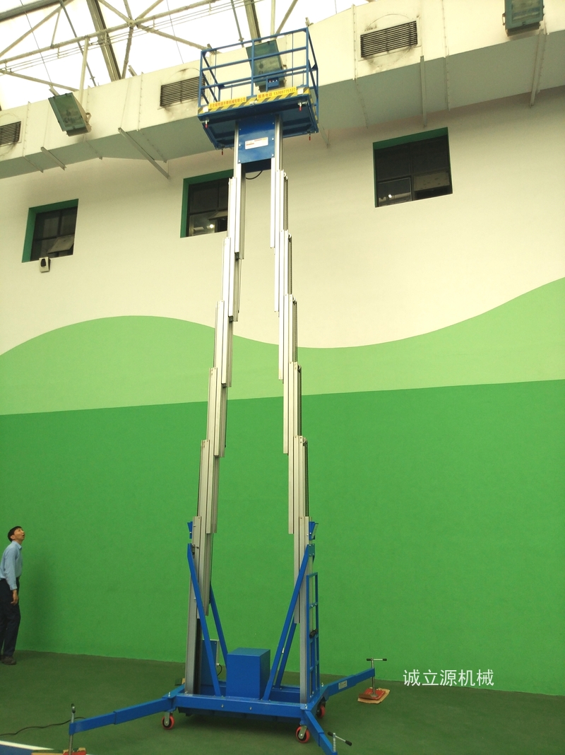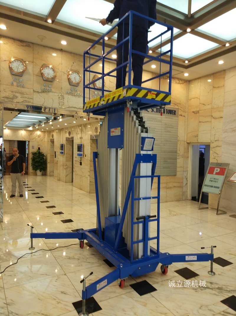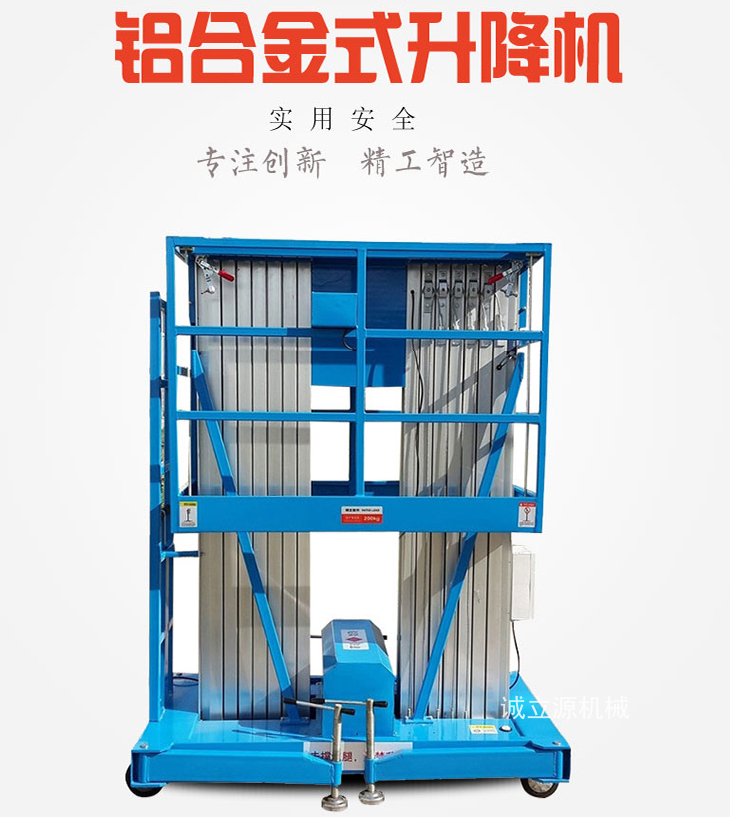 铝合金升降平台采用高强度优质铝合金型材,具有造型美观、体积小、重量轻、升降平稳、安全可靠等优点,可上下操作,广泛用于工厂、宾馆、餐厅、车站、机场影剧院、展览馆等场所,是保养设备、高空涂刷、调换灯具、电器、清洁等用途的升降设备。单桅柱豪华铝合金式升降平台:该系列产品为室内型,广泛适用于星级酒店,大型超市等各行业大厅、厂房内的高空作业,具有升降平稳,操作方便,能进入一般门厅,可进出电梯且耗电少、无污染、工作时不伤地面,可用于贴墙工作及探出作业,工作无死角。。双桅柱豪华铝合金式升降平台:全新设计的新一代产品,整体采用高强度铝型材型材精制而成,由于型材强度高,使升降台的偏转与摆动小。采用双桅柱式结构,载重量大,平台面积大,稳定性好,运转灵活,推行方便。它轻盈的外观,能在小空间内发挥较高的举升能力。该升降机广泛用于厂房、宾馆、大厦、商场、车站、机场、体育场等。可用作电力线路、照明电器、高架管道等安装维护,高空清洁等高空作业。三桅柱豪华铝合金式升降平台: 三组桅柱支撑作业平台同步升降,底盘支腿结构同单双桅柱式平台,具有超大的载重量。整体升降式护栏装置,强度好,运输时大幅度地降低整机自身高度,装卸十分方便。该升降机承载能力强,适合于两人(可携带一定的重量工具和材料)同时登高作业;还可根据不同环境订制各种非标产品,以满足不同需要。四桅柱豪华铝合金式升降平台: 整体采用高强度铝型材精制而成,由于型材强度高,采用四桅柱式结构,稳定性好,运转灵活,载重量大,平台面积大,推行方便。它轻盈的外观,能在小空间内发挥较高的举升能力。使升降平坦台的摆动减小。该升降机广泛用于厂房、宾馆、大厦、商场、车站、机场、体育场、军队、港口等。可用作电力线路、照明电器、高架管道等安装维护,高空清洁等高空作业。整体采用高强度的铝型材作为升降立柱,起升动力经过液压泵站是液压油缸伸缩,带动链条传动能够上下升降,使高空作业变得方便快捷!六桅柱豪华铝合金式升降平台:整体采用高强度铝型材精制而成,由于型材强度高,采用六桅柱式结构,稳定性好,运转灵活,载重量大,平台面积大,推行方便。它轻盈的外观,能在极小的空间内发挥较高的举升能力。多柱式使升降台的摆动减小。该升降机广泛用于厂房、宾馆、大厦、商场、车站、机场、、军队、港口、体育场等。(根据需要可定制铝合金升降舞台等,以上款式还可以加装到汽车底盘上,让使用便捷、高效。)