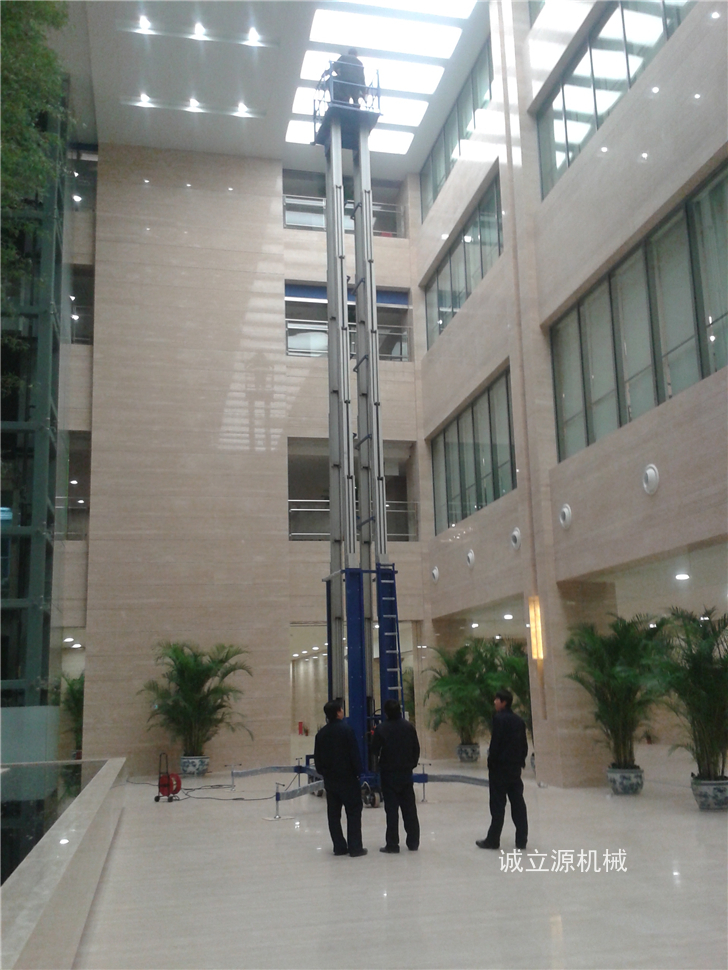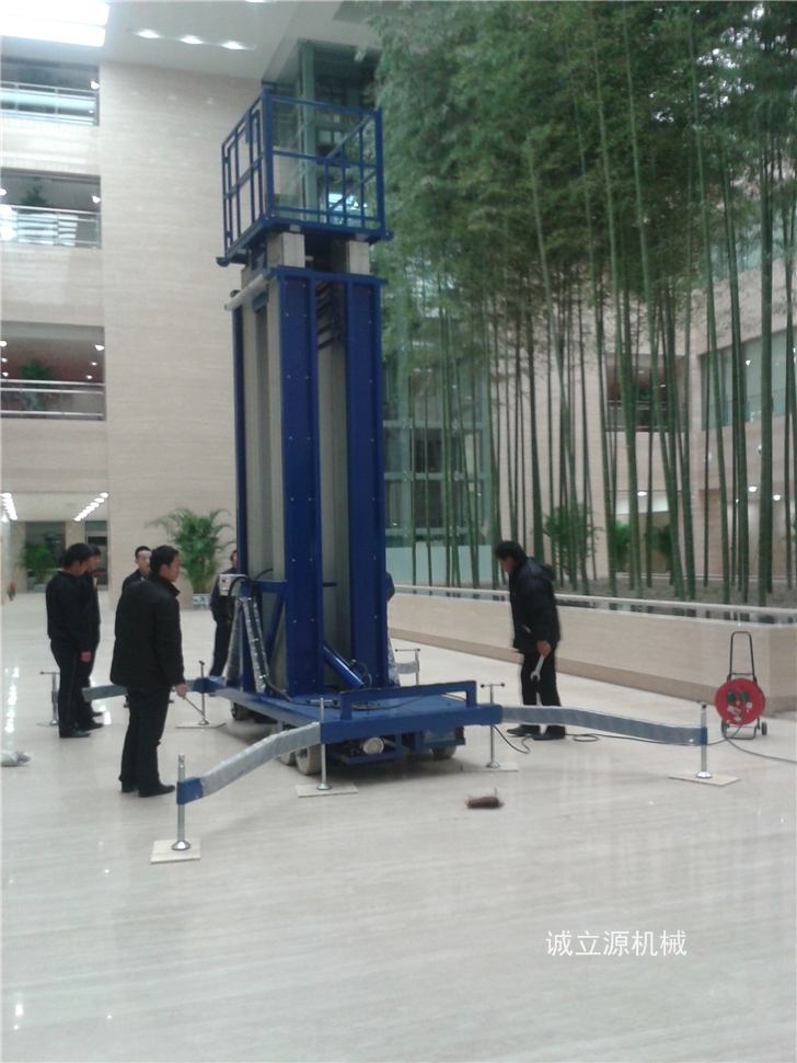 六桅柱豪华铝合金式升降平台 :整体采用高强度铝型材精制而成由于型材强度高,采用六桅柱式结构,稳定性极好,运转灵活,载重量大,平台面积大,推行方便。它轻盈的外观,能在极小的空间内发挥最高的举升能力。使升降台的偏转与摆动极小。该升降机广泛用于厂房、宾馆、大厦、商场、车站、机场、体育场等。可用作电力线路、照明电器、高架管道等安装维护,高空清洁等单人工作的高空作业。