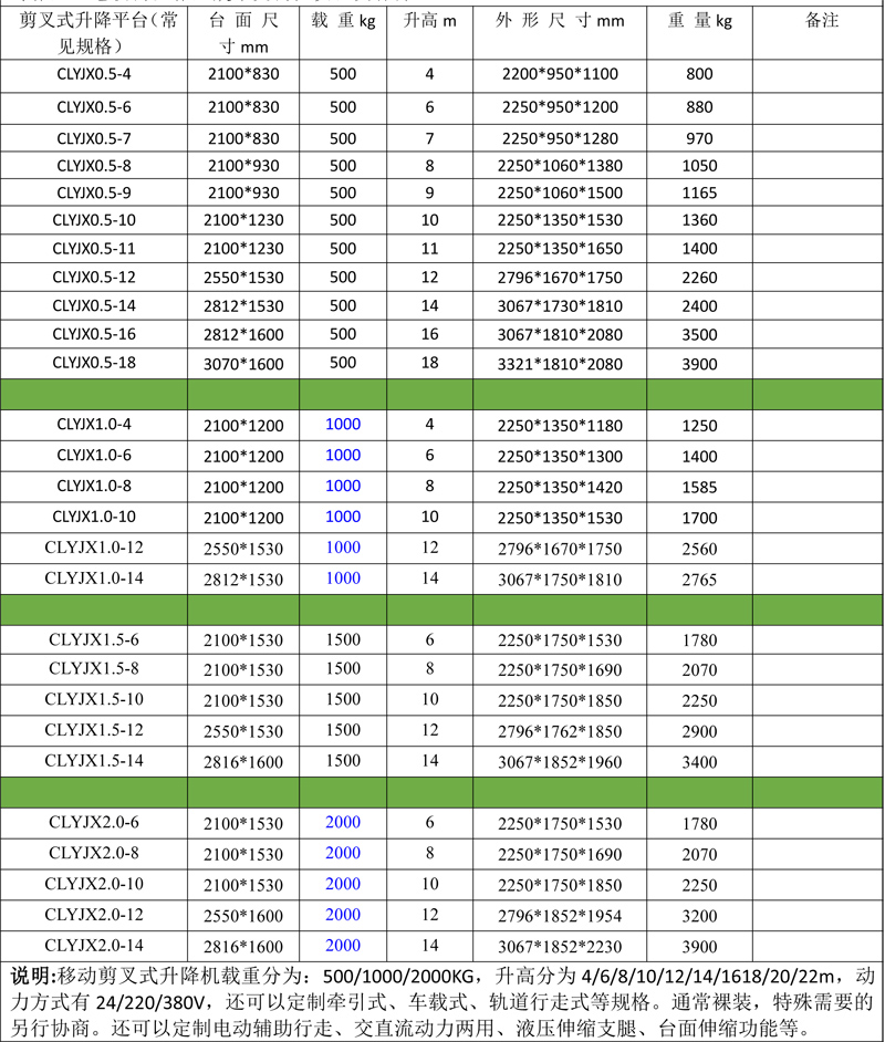 1、液压升降平台可分为:四轮移动式、两轮牵引式、汽车改装式、电瓶车式、辅助自行式、起升高度从 4 米至 22 米不等。此系列产品载重分为 0.1 至 0.8 吨,也可根据用户要求定做,最高载重可达 170 吨。