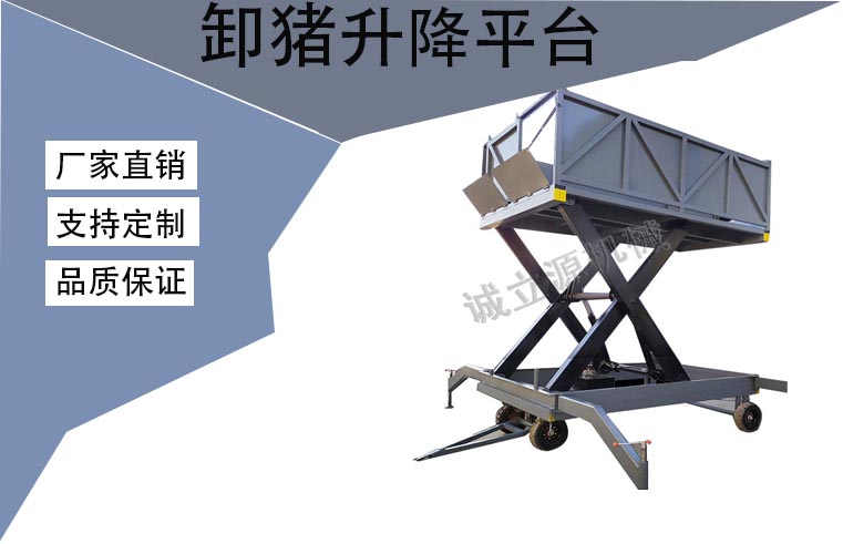 卸猪升降平台(系装卸货升降平台范围):分为移动式和固定式两款,也可以分为剪叉式升降和倾斜式升降两类。装卸货升降平台:在现代物流现场已是一非常易见的结构形式。它是企业物流链的起点与终点,是企业快速、安全周转产品及货物的一个装卸货平台。传统的装卸货平台高度固定,但来往运输车辆的厢地高度不一,运输车辆与装卸货站台之间总是形成一定的高度落差或间隙。造成搬运叉车不能进出运输车辆直接装卸货物。运用可升降的卸猪平台是提供可靠的衔接。使搬运叉车能够安全、快速进出运输车辆进行装卸货作业。