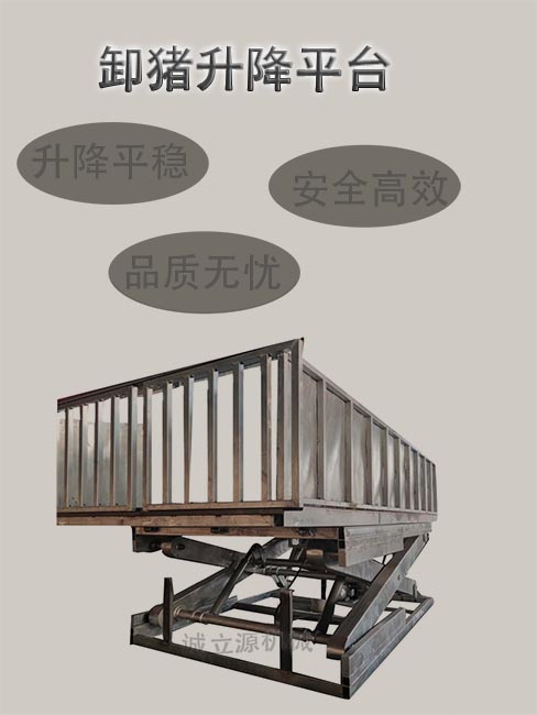 卸猪升降平台(系装卸货升降平台范围):分为移动式和固定式两款,也可以分为剪叉式升降和倾斜式升降两类。装卸货升降平台:在现代物流现场已是一非常易见的结构形式。它是企业物流链的起点与终点,是企业快速、安全周转产品及货物的一个装卸货平台。传统的装卸货平台高度固定,但来往运输车辆的厢地高度不一,运输车辆与装卸货站台之间总是形成一定的高度落差或间隙。造成搬运叉车不能进出运输车辆直接装卸货物。运用可升降的卸猪平台是提供可靠的衔接。使搬运叉车能够安全、快速进出运输车辆进行装卸货作业。